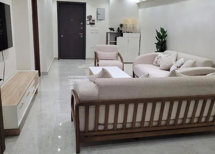 Luxury Apartment Near Cairo Festival City With Free Parking & Wi-Fi provides guests with a balcony and a living room, as well as such modern comforts as air conditioning. The apartment is equipped with a bathroom that features hairdryers and bath sheets.
